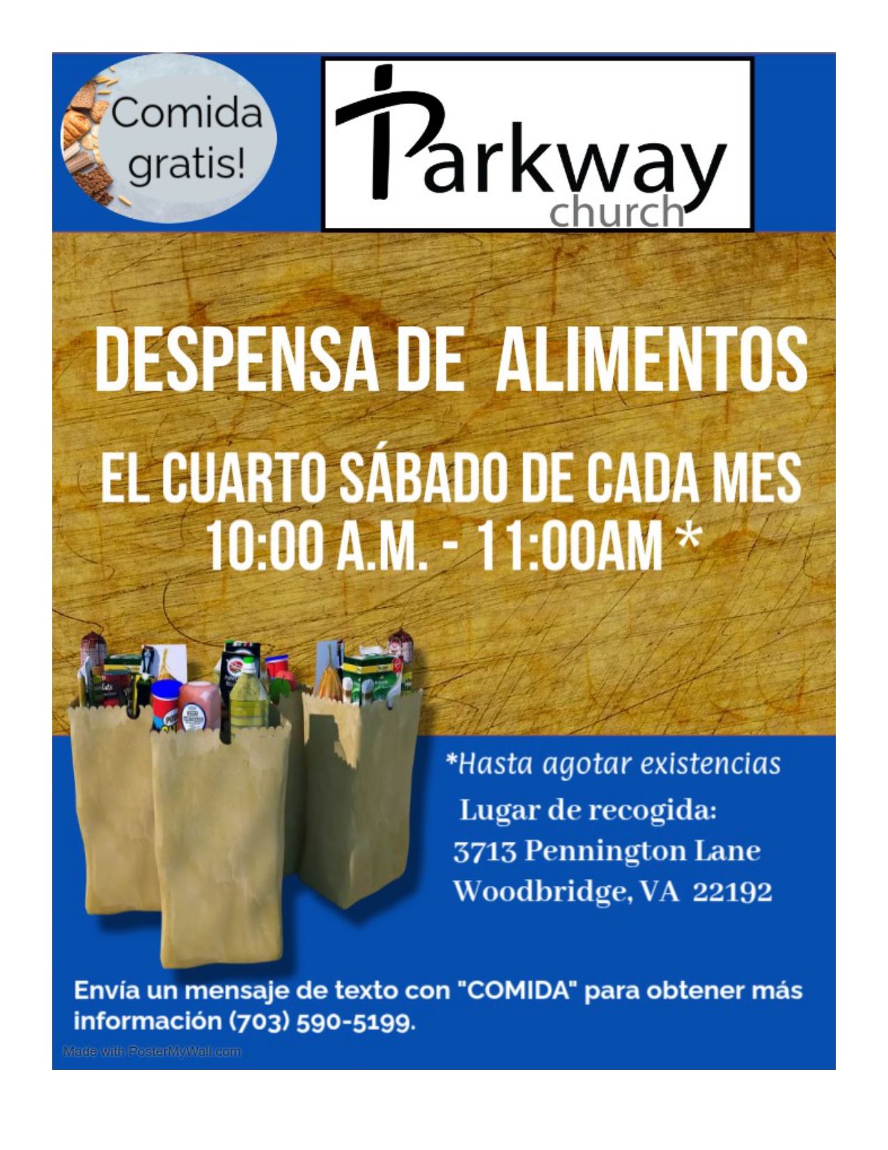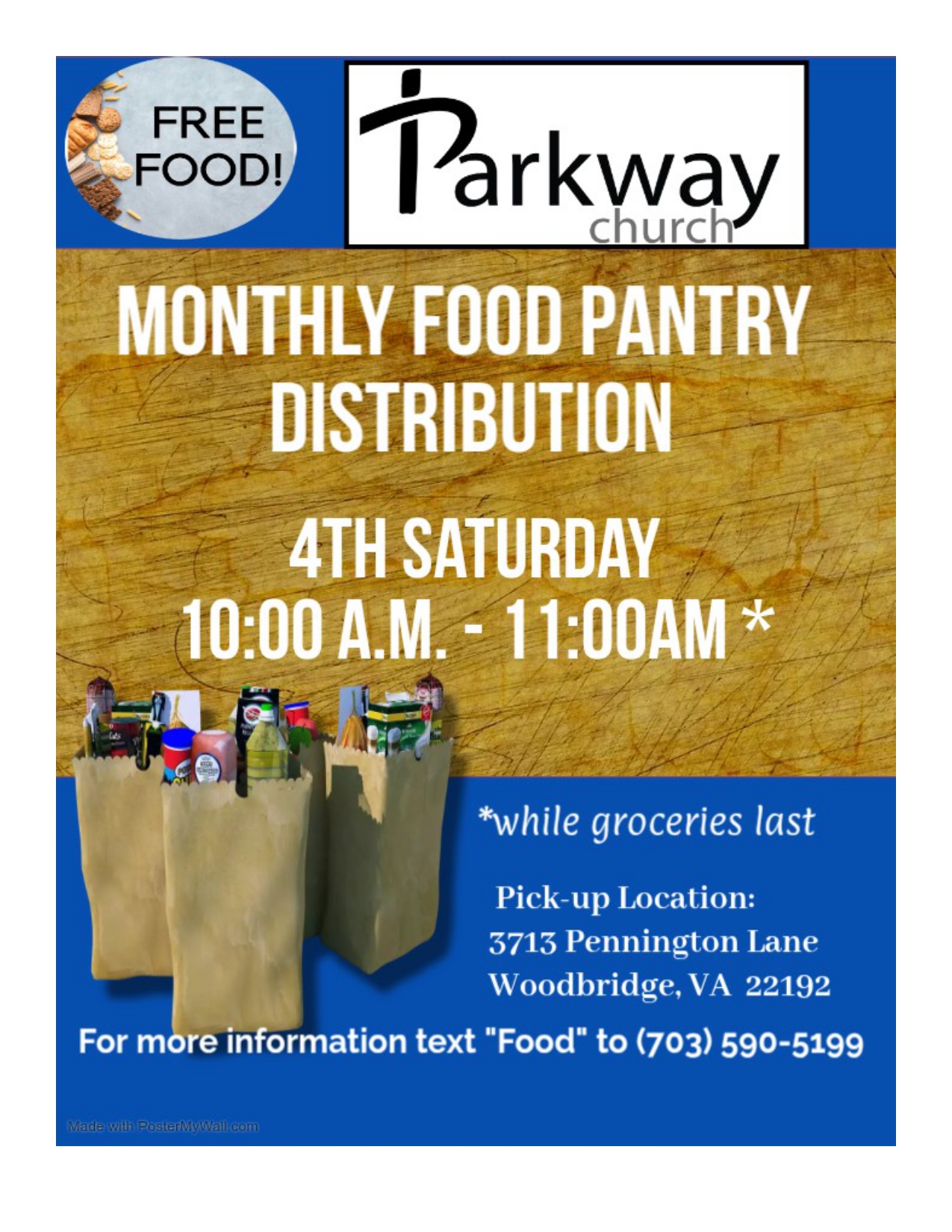 The Food Pantry is located at Parkway Church, 3713 Pennington Lane, Woodbridge, VA 22192.